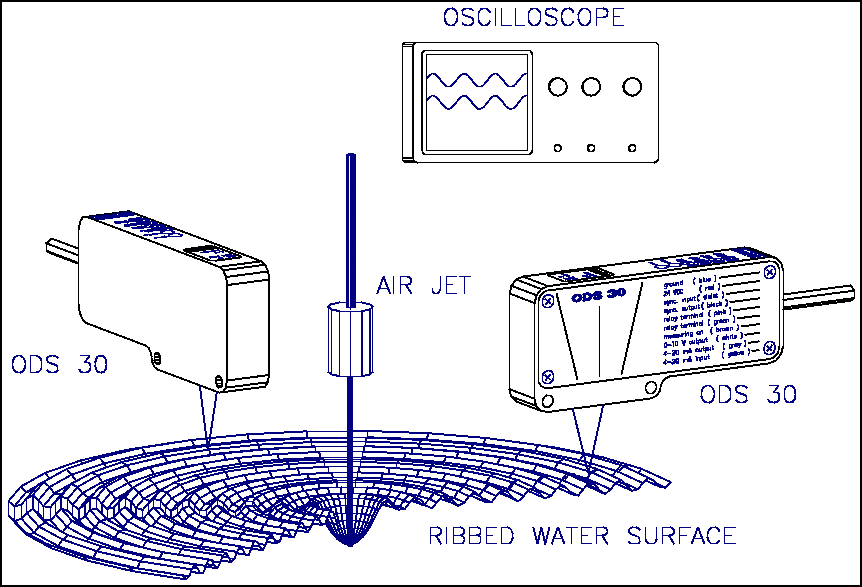 Saclay simulates the plasma by means of water and the arc by means of an air jet. With two ODS 30 sensors, measurements are performed on the propagation of the wave in two directions. The air jet uses a very small pressure, and thus the waves formed are very small. The amplitude of the waves is detected by the sensors, and by means of an oscilloscope it is possible to transform the measurements to frequencies.